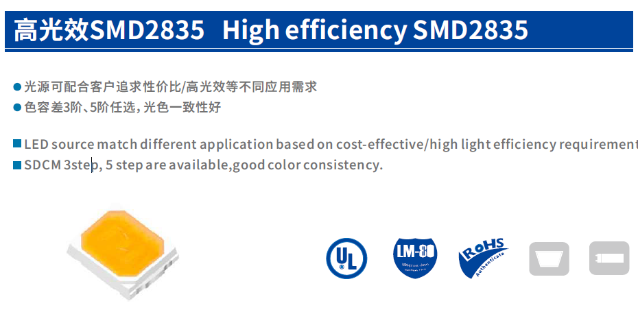 高光效 SMD2835是適用於普通照明應用的高性價比LED光源。提供 3 階、5 階色容差並具優質色完性。適用於燈帶、面板燈、燈泡等各類家用與商用照明應用。
