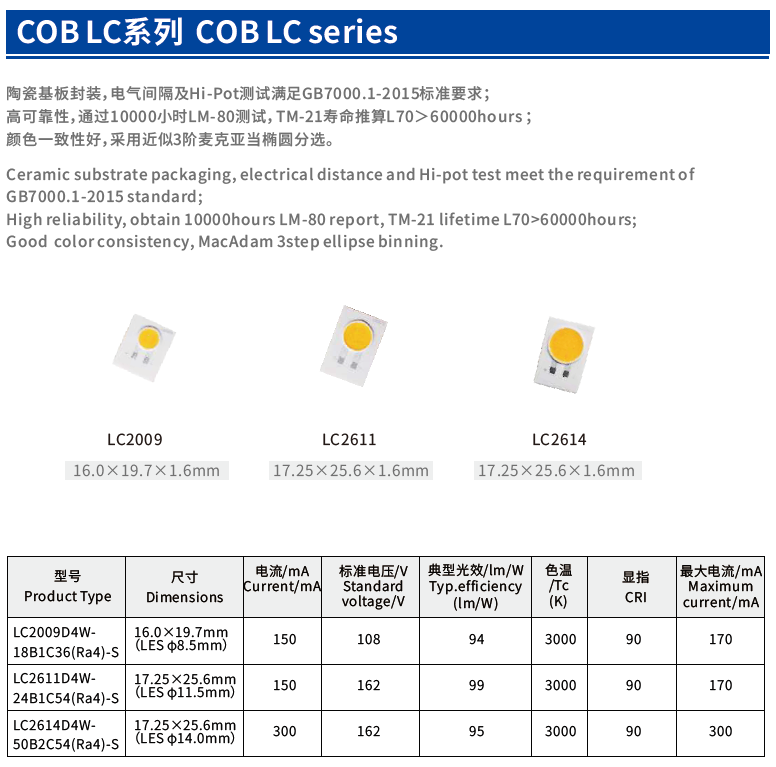 COB LC 系列採用陶瓷基板封裝,符合 GB7000.1-2015 的絕緣測試標準。通過10000小時LM-80測試,推算壽命L70>60000小時,具備優異的穩定性與色彩一致性。