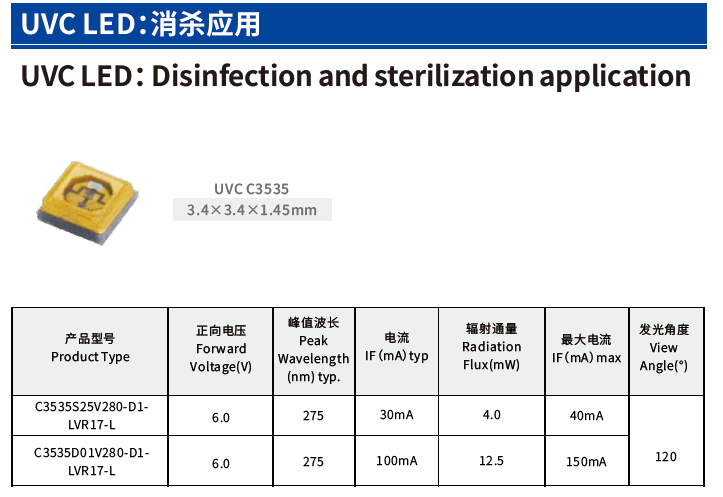 UVC LED UVCC3535 提供波長在275nm左右的深紫外輸出,有效破壞細菌與病毒DNA結構。常應用於電梯扶手殺菌、空氣淨化器、飲水設備等消毒裝置,滿足公共衛生與家電安全需求